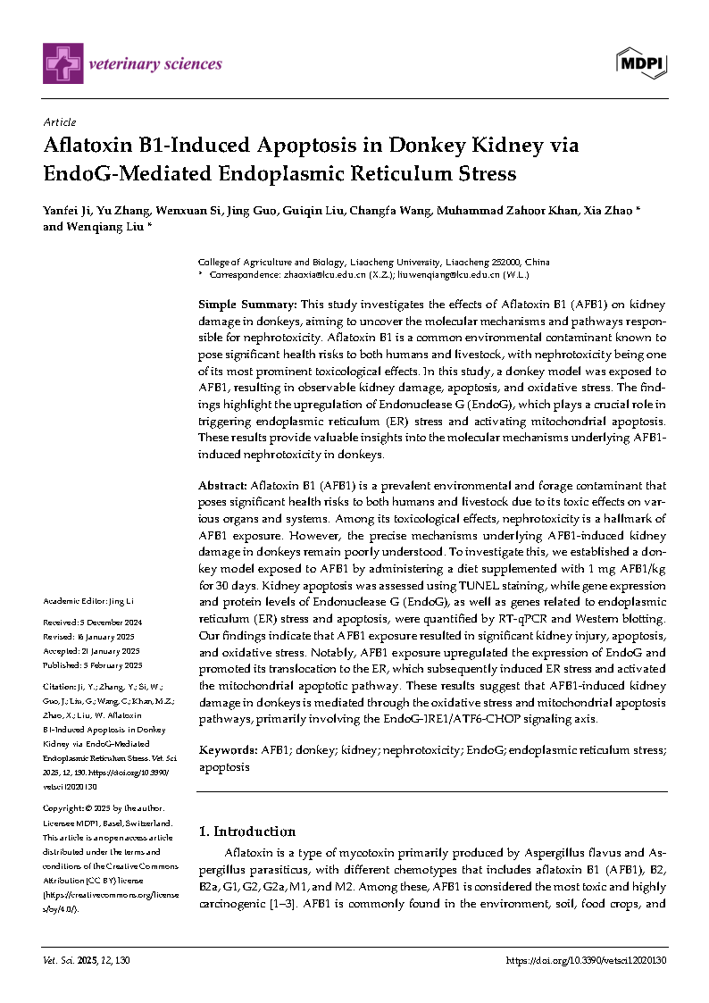 bat3652022级动物学专业研究生纪言霏在《Veternary Science》杂志上发表了题为“Aflatoxin B1-Induced Apoptosis in Donkey Kidney via EndoG-Mediated Endoplasmic Reticulum Stress”的研究论文,指导教师为刘文强教授、赵霞博士。