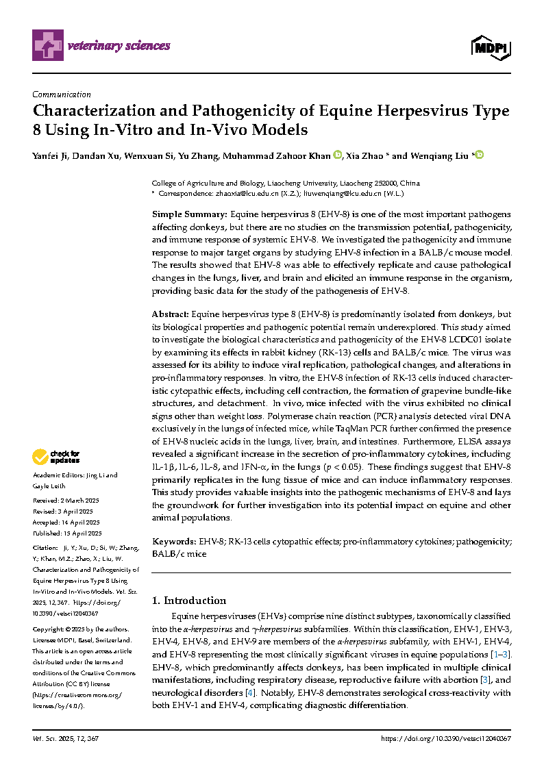 bat3652022级动物学专业研究生纪言霏在《Veternary Science》杂志上发表了题为“Characterization and Pathogenicity of Equine Herpesvirus Type 8 Using In-Vitro and In-Vivo Models”的研究论文,指导教师为刘文强教授、赵霞博士。