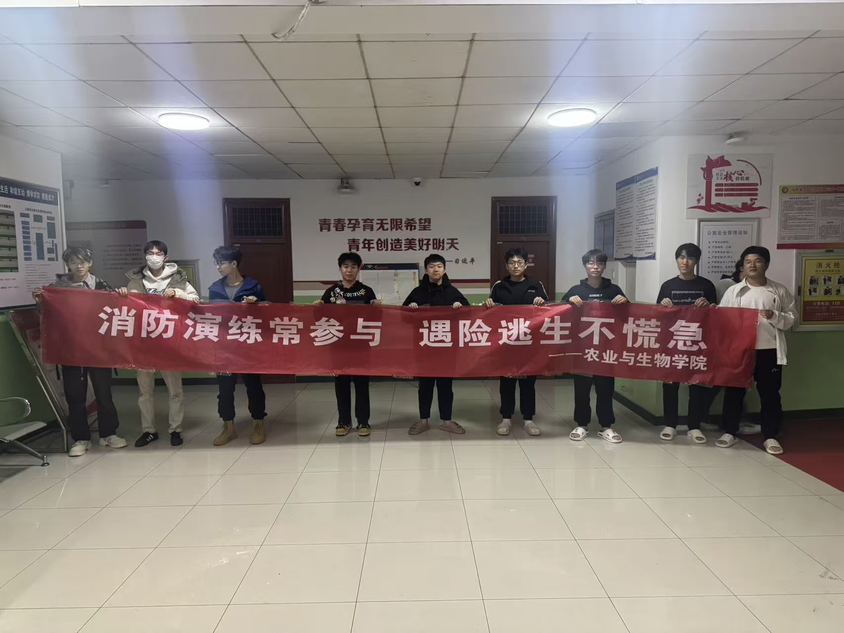 集结完毕后,程治龙老师结合本次演练的实际过程,先对疏散环节中的亮点进行肯定,同时也指出了可优化的细节。随后,程治龙老师重点强调了逃生演练的重要性:“大家或许觉得火灾离我们很远,但意外往往突如其来。逃生演练不是‘走过场’,每一次弯腰、每一次避让、每一条疏散路线的记忆,都是在为可能的险情筑牢‘生命防线’。”最后,同学们共同展开“消防演练常参与 遇险逃生不慌急”的主题横幅,在镜头前喊出“安全在心、防患未然”的口号。
