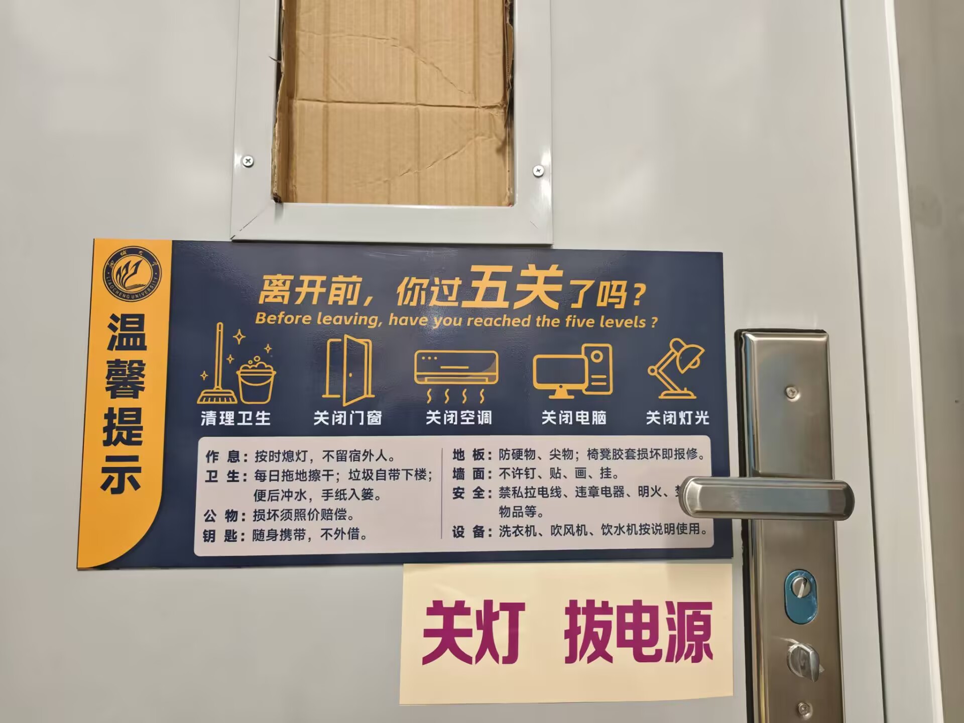 此次安全标语规范张贴活动,以“视觉化、规范化”的宣传方式,既填补了宿舍安全宣传的细节空白,更推动安全意识从“被动接受”转向“主动遵循”。让“标识醒目、公约践行”成为宿舍安全管理的常态,切实守护同学们的住宿安全。