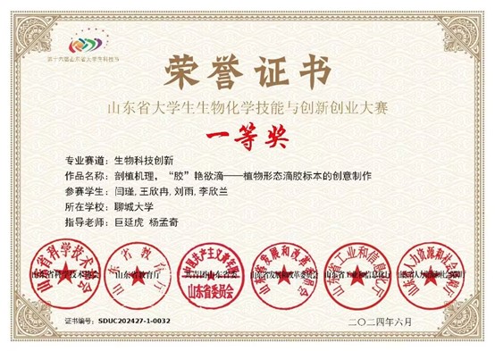 bat365刘雨同学在山东省大学生生物化学技能与创新创业大赛中荣获一等奖,对该获奖同学予以祝贺表彰。