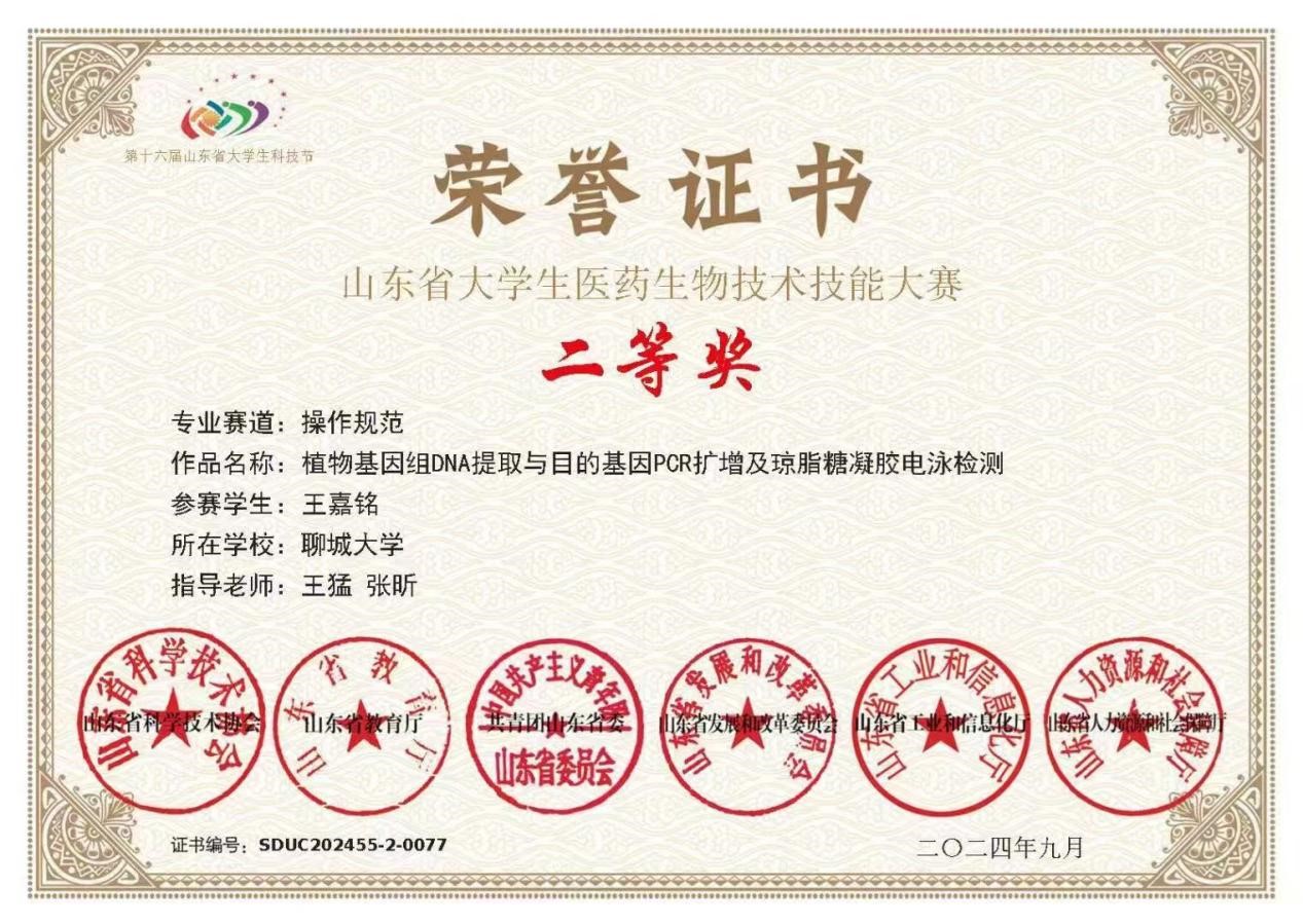bat365王嘉铭同学在山东省大学生医药生物技术技能大赛中荣获二等奖,对该获奖同学予以祝贺表彰。