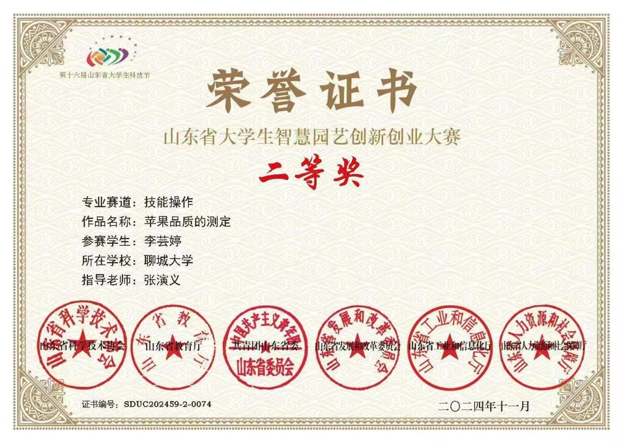 bat365李芸婷同学在山东省大学生智慧园艺大赛中荣获二等奖,对该获奖同学予以祝贺表彰。